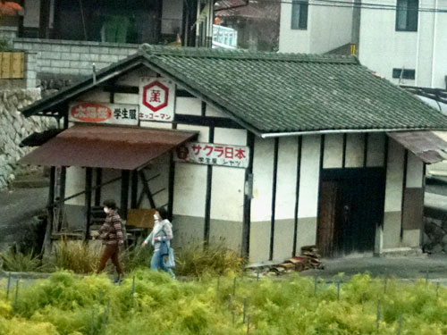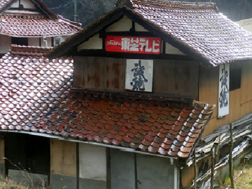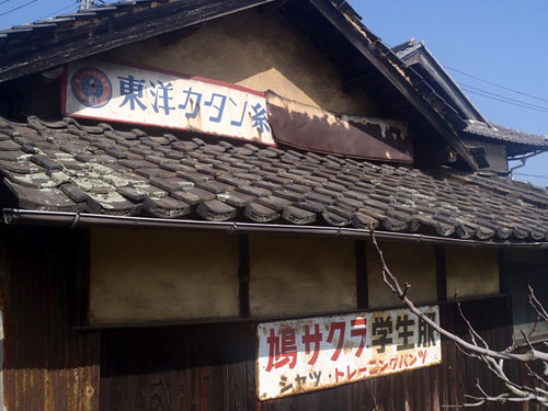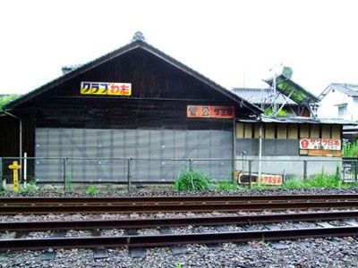 ▼JR芸備線沿いの看板屋敷。九州でよく見かけるほていわたや、カクイわたのねんねこ看板が目を引く。