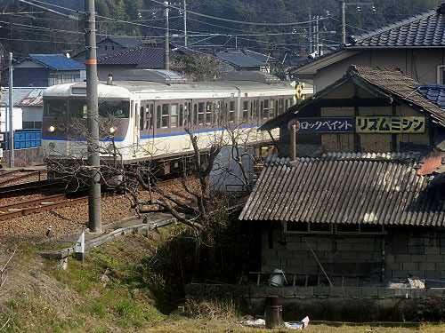 ▼JR福塩線沿いにある看板。組み看板は九州地方にあると聞いているが、中国地方では初見。電車とのコラボがうまく撮れました。(ジャンボフェニックスさん情報)